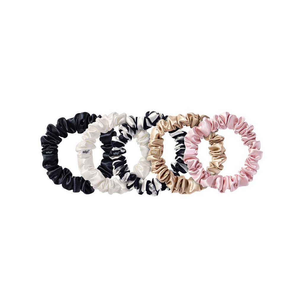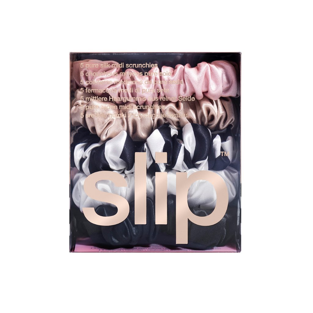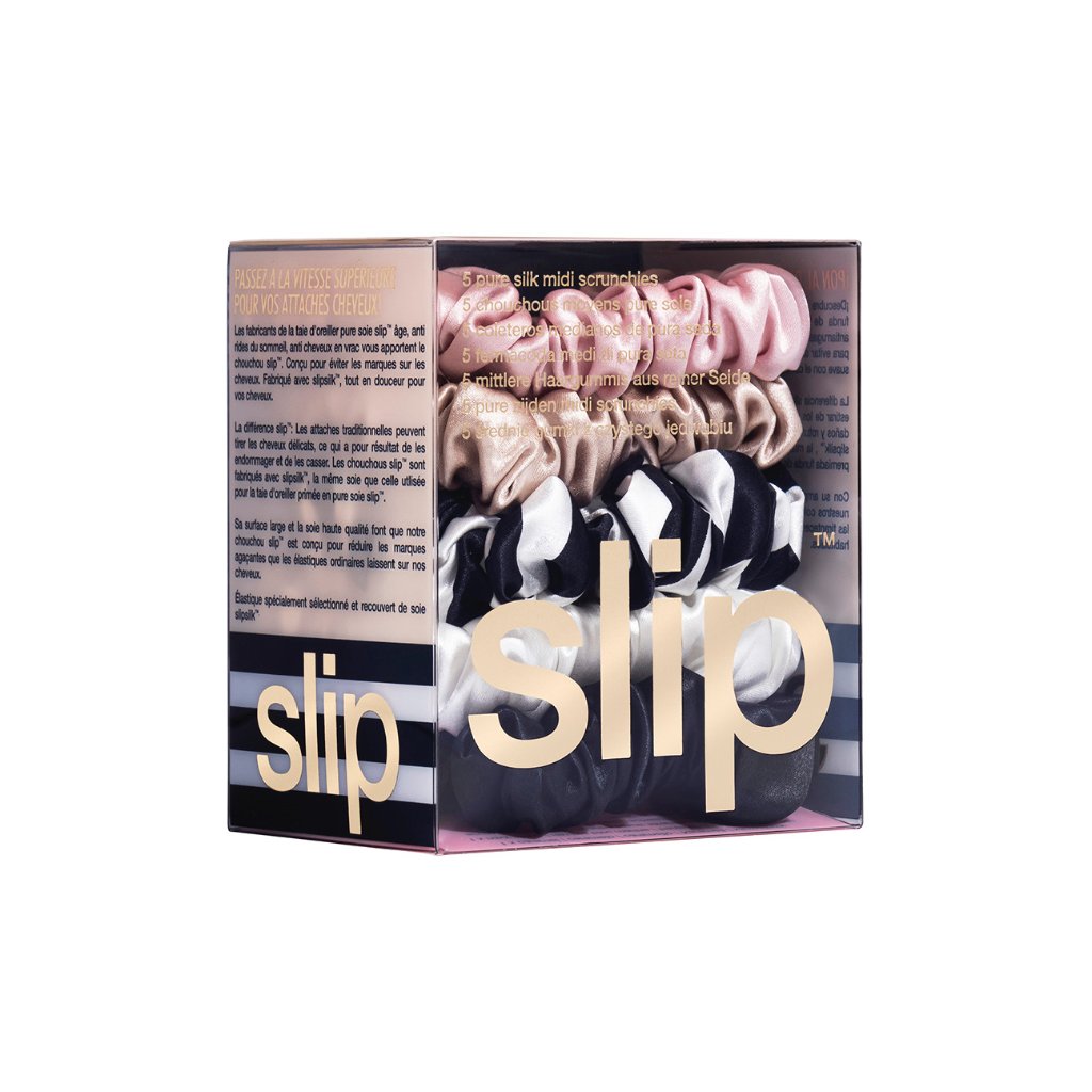 - Tato sada obsahuje: 1x černá, 1x růžová, 1x bílá, 1x černobílá, 1x karamelová gumička Multi Midi slipsilk™.