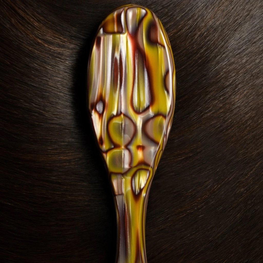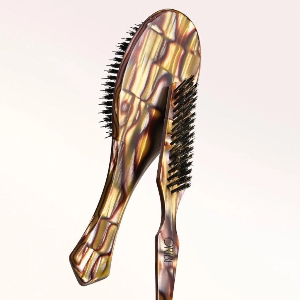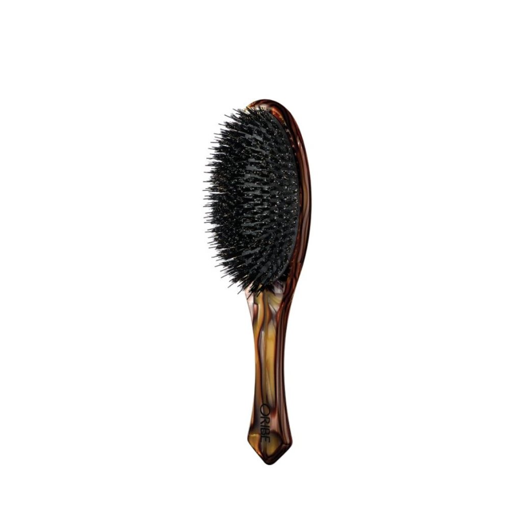 Plochý kartáč Oribe je vyroben ze zakázkové italské pryskyřice a kombinuje řemeslné zpracování s ergonomickou rukojetí pro dokonalý úchop a vyváženou hmotnost. Kartáč je kombinací kančích štětin a zaoblených nylonových štětin s polštářkem z 97% přírodního kaučuku pro jemnou stimulaci pokožky hlavy a mimořádně hladký a lesklý vzhled.
