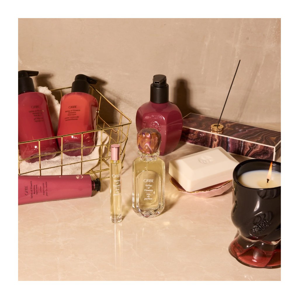 Hedvábné mýdlo nasycené vůní Valley of Flowers povznáší čistící zážitek se svěžími květinovými tóny bulharské růže, květů pivoňky a krémového pižma.
