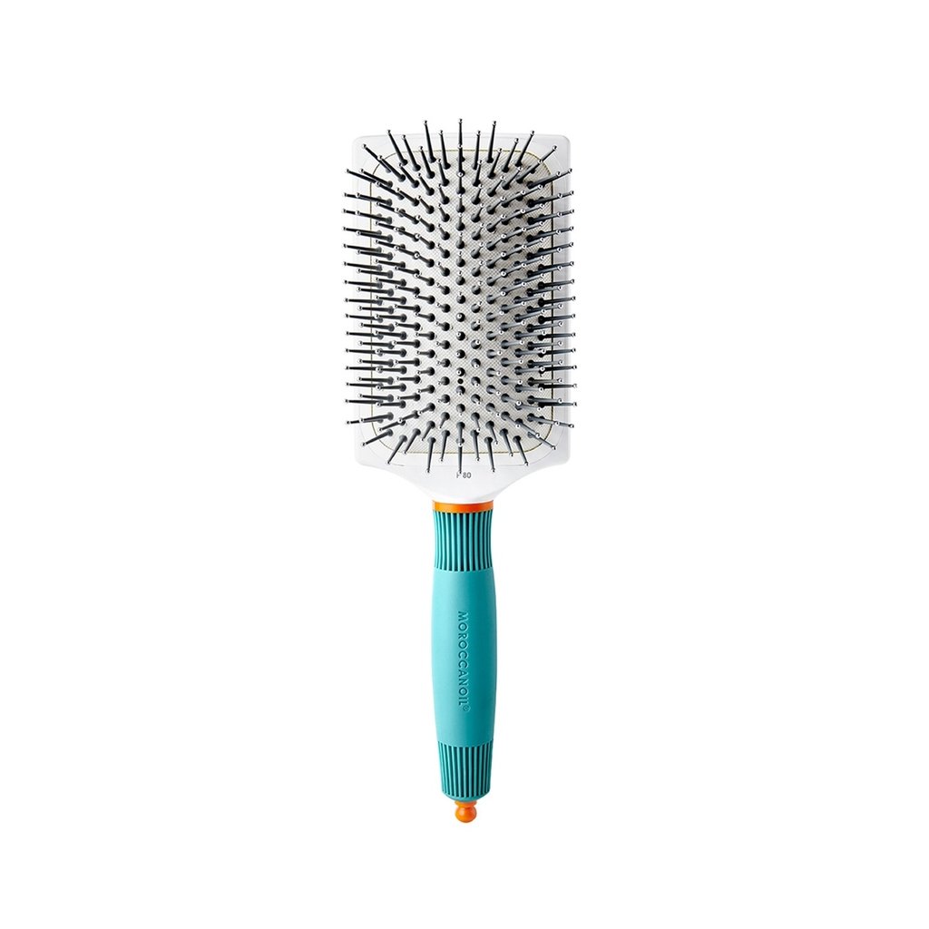 Plochý kartáč Moroccanoil je perfektním pomocníkem při úpravě dlouhých vlasů. Kartáč má keramické tělo s ionizovaným povrchem, které zajišťuje rovnoměrné vedení tepla při fénování. Fénování tak urychluje, zamezuje působení statické elektřiny a poletování vlasů. Díky teplu odolným měkkým nylonovým štětinám jsou vlasy viditelně zdravější a mnohem lépe se upravují. Vzduchový polštář, ve kterém jsou štětiny vloženy snižuje odpor vlasů a zvyšuje flexibilitu štětin. Kartáč má ergonomický tvar rukojeti a výsuvný hrot na oddělování pramenů.